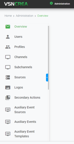 The Administration menu enables the administrator to manage all the necessary elements of VSNCrea, such as users, profiles, channels, subchannels, etc.
