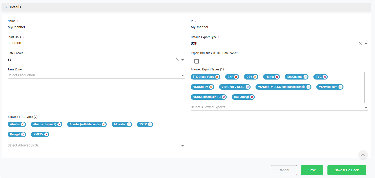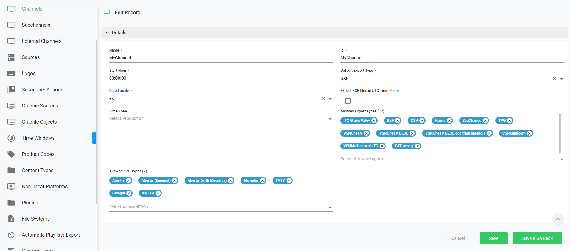 Allowed EPG Types. Select the EPG export formats you want to enable for the specific channel