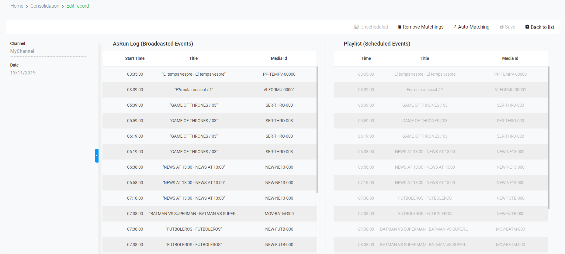 The Consolidations module is designed to carry out the tasks right after the broadcast. From this interface users will be able to validate the broadcasted events from the AsRunLog generated by the corresponding automation system for each channel, to detect possible inconsistencies between the scheduled events in VSNCrea and the real broadcasted ones in the automation system, and consolidate them.