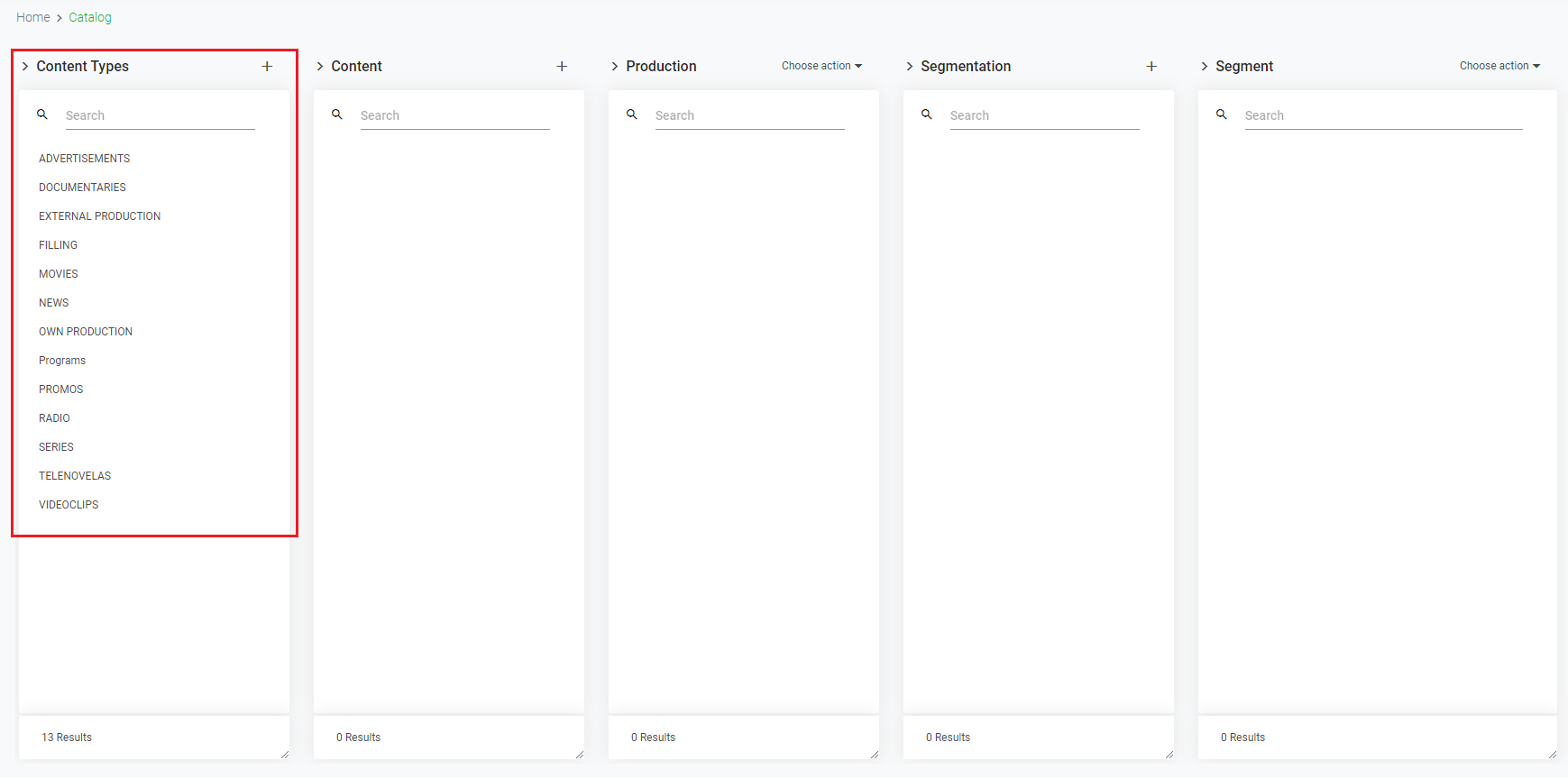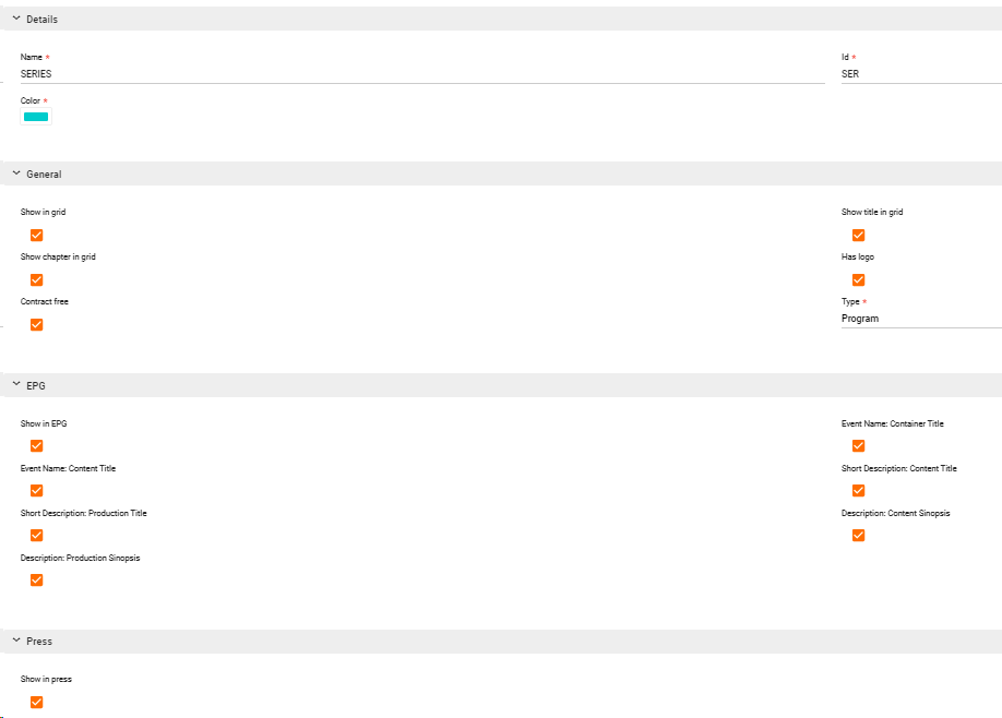 This is the first element to classify the productions of the catalog. Contents can be grouped into types. Content types could be: movies, shows, series, commercials, promos, bumpers, etc.