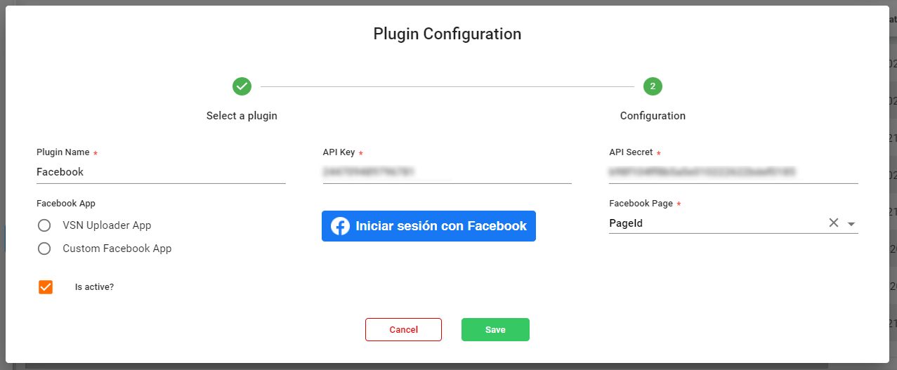 Facebook App. You can use the VSN Uploader APP or if you have an existing Facebook App you can use yours.