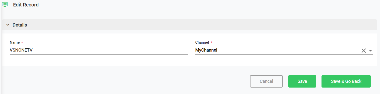 To cancel the edit, click "Cancel". To save the changes and keep in the edit form, click "Save". To save the changes and go back to the previous list, click "Save & Go Back".