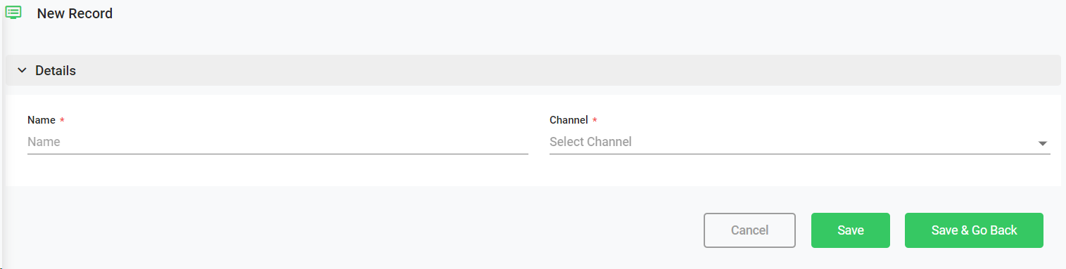 To cancel the operation, click "Cancel". To save the changes and keep in the creation form, click "Save". To save the changes and go back to the previous list, click "Save & Go Back".