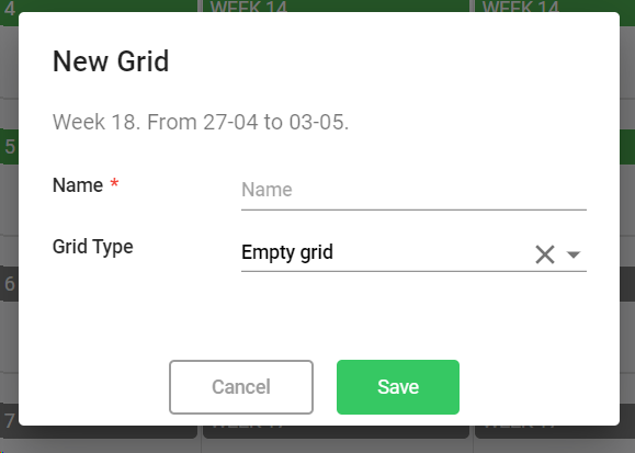 Click on any part of the screen over one specific week to create the weekly schedule or grid for that specific week, that will contain all its related playlists. This will open the dialog to create a new grid: