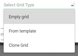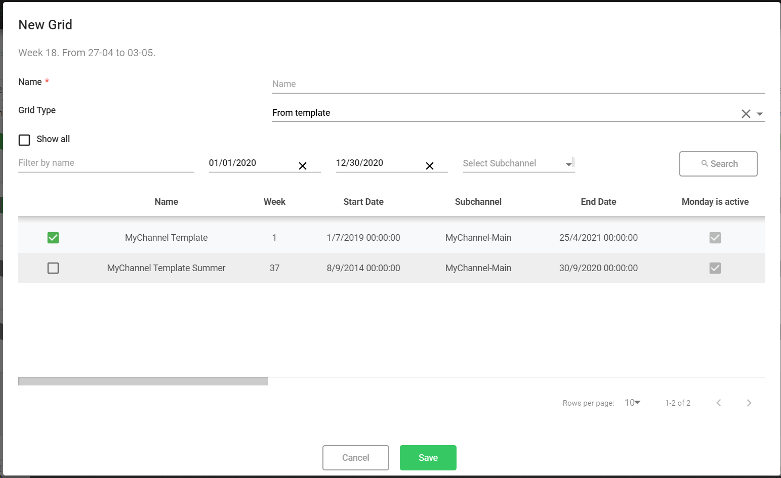 From template. When you select this option, the dialog will show all the available templates. You can filter by name, date, subchannel, etc. Find and select the template you want to use to create the new grid. For more information go to Templates