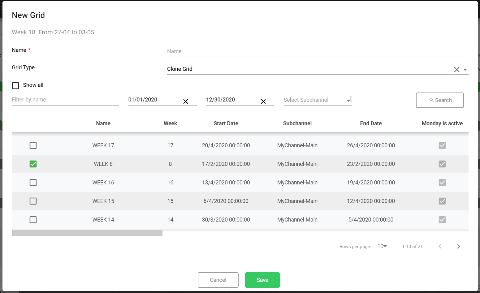 Clone grid. When you select this option, the dialog will show you grids of other weeks. You can filter by name, date, subchannel, etc. Find and select the grid you want to clone to create your new grid.