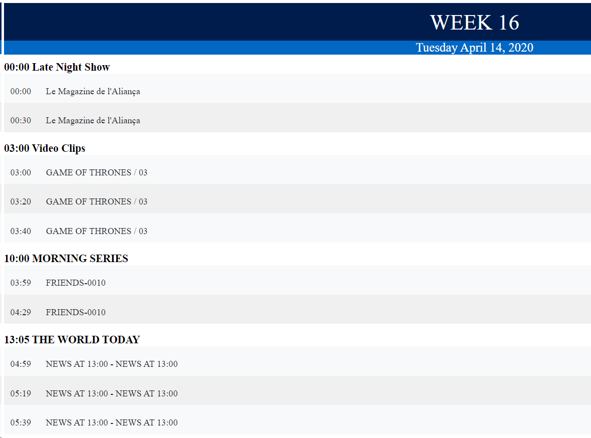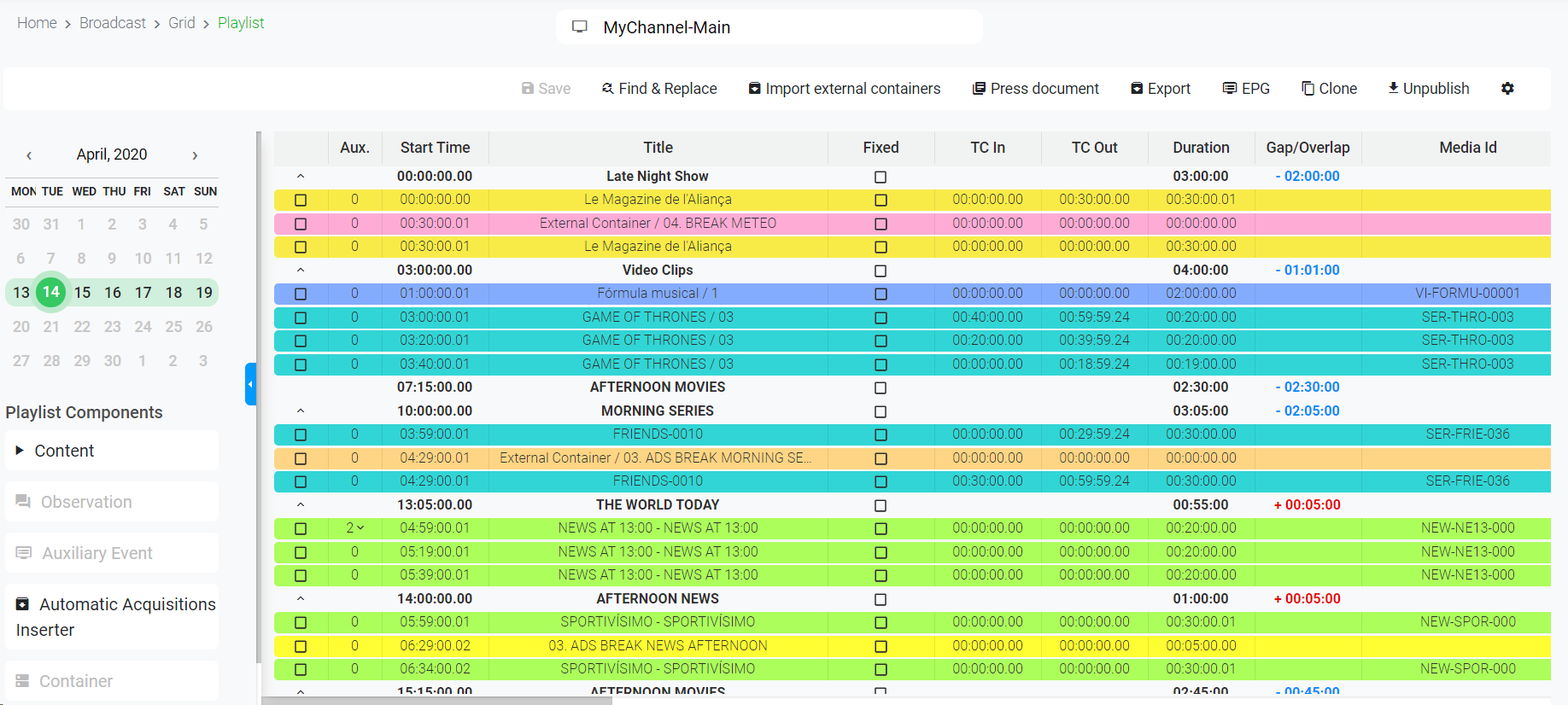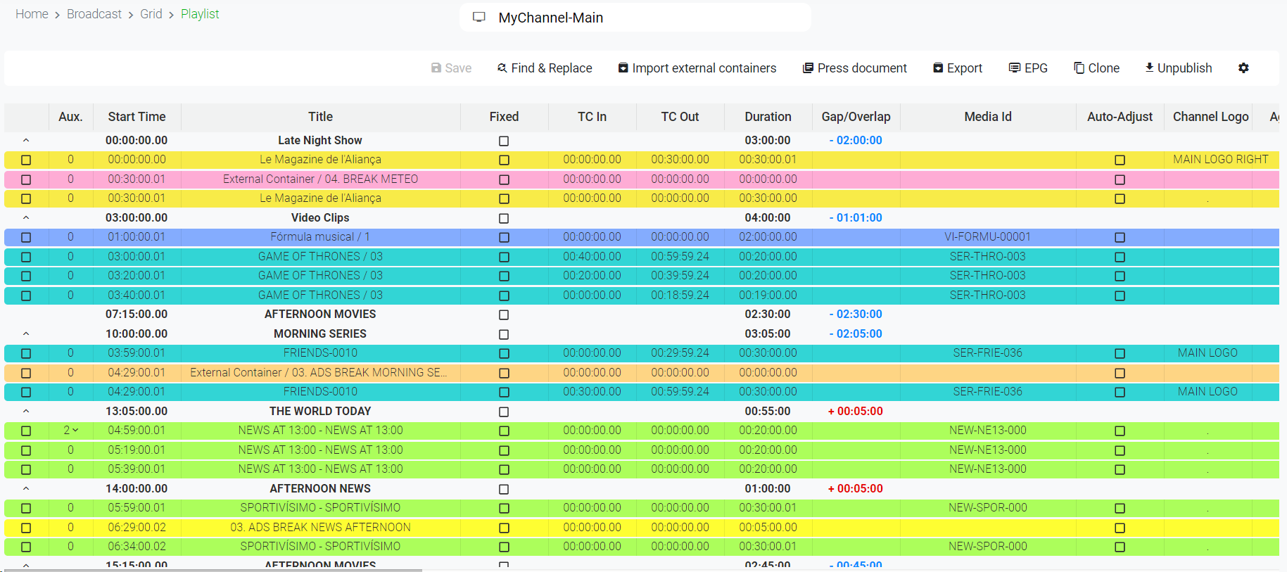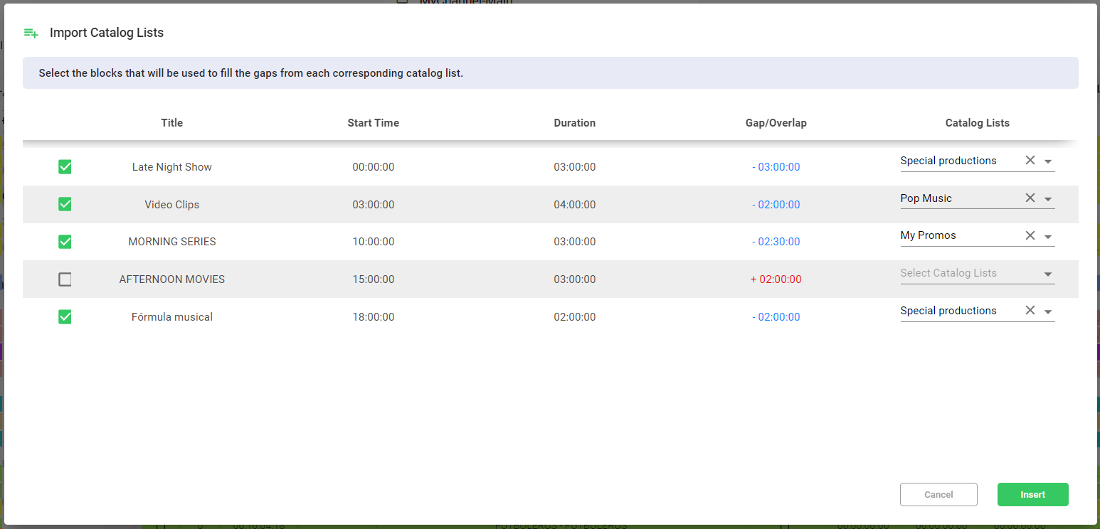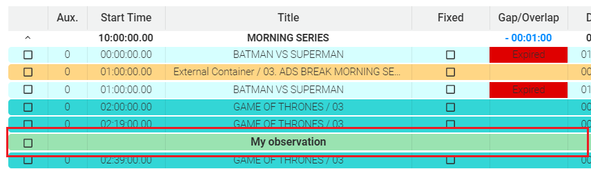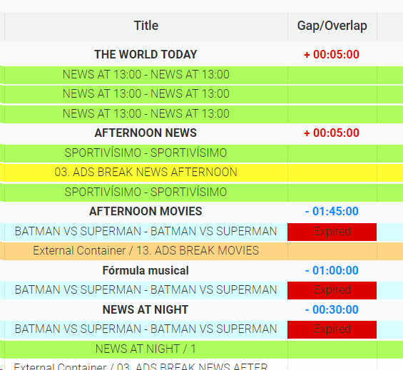 The column "Gap/Overlap" indicates if the total duration of the events inside a block is exceeding (+) or not reaching (-) the duration of the block. This column is also used to indicated the productions of the catalog that are expired for that specific day: