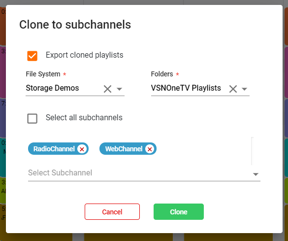If the box is checked, the action will clone the playlist to all the subchannels of the organization.