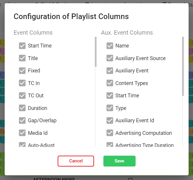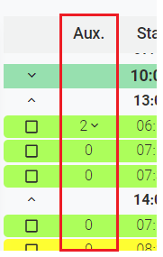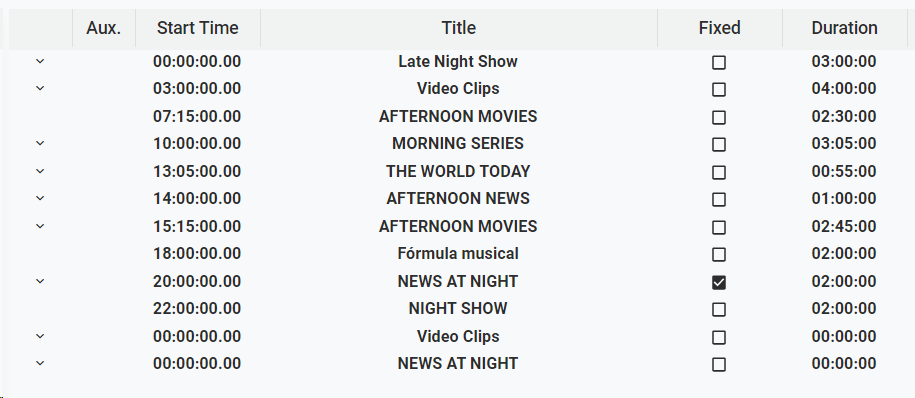 The column "Aux." indicates the number of graphics included in each main event. For more information on how to add graphics into a playlist, go to Graphics Catalog