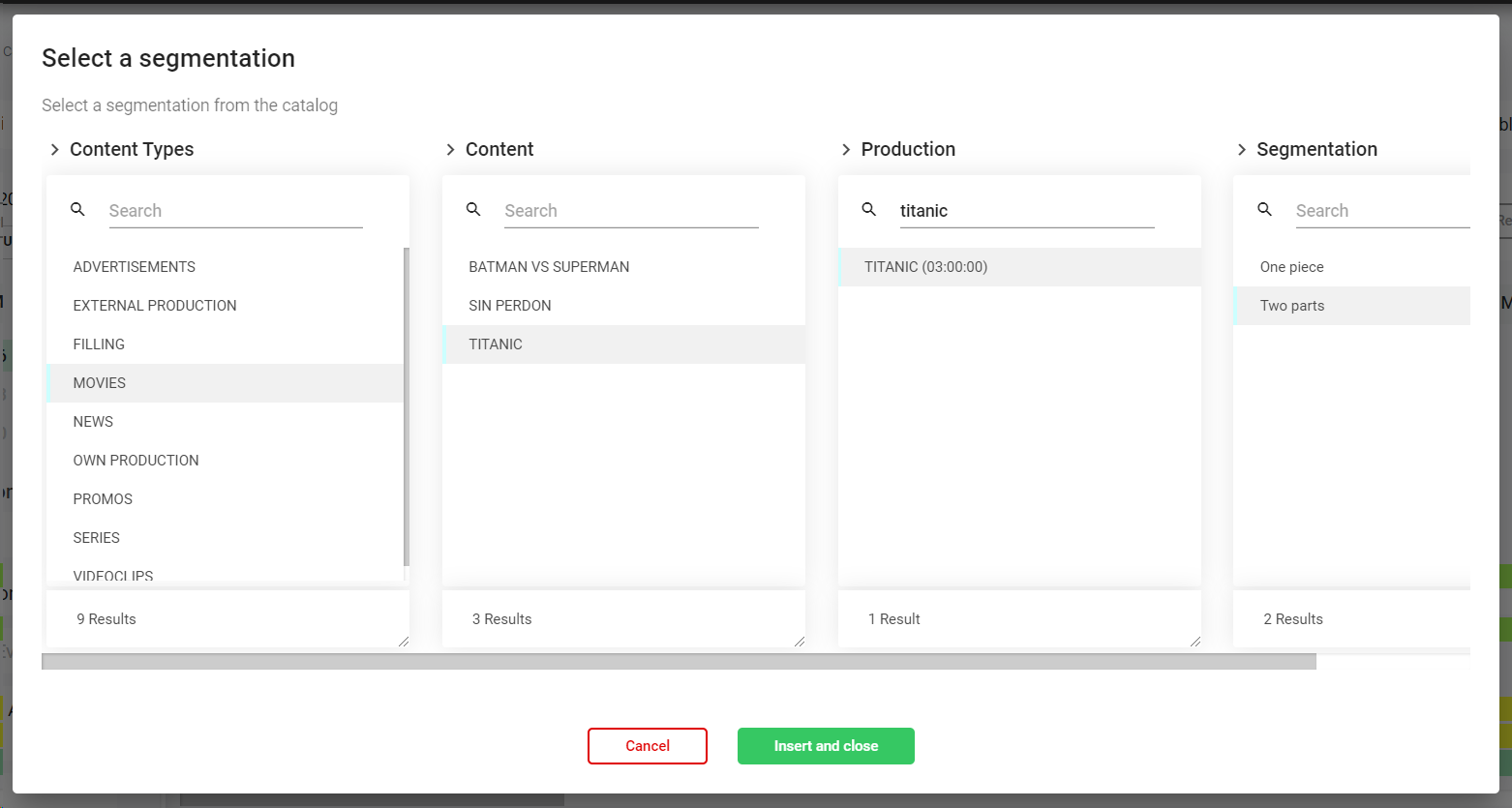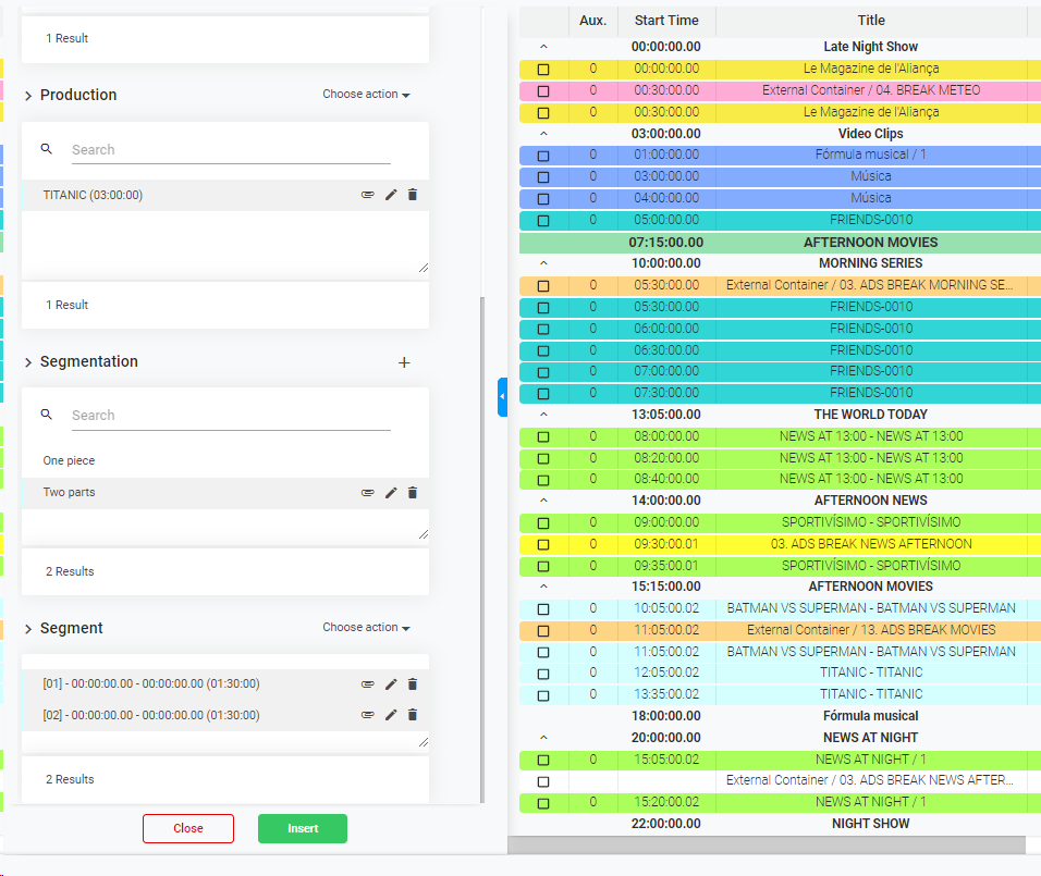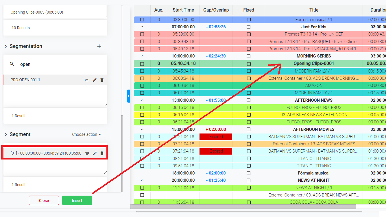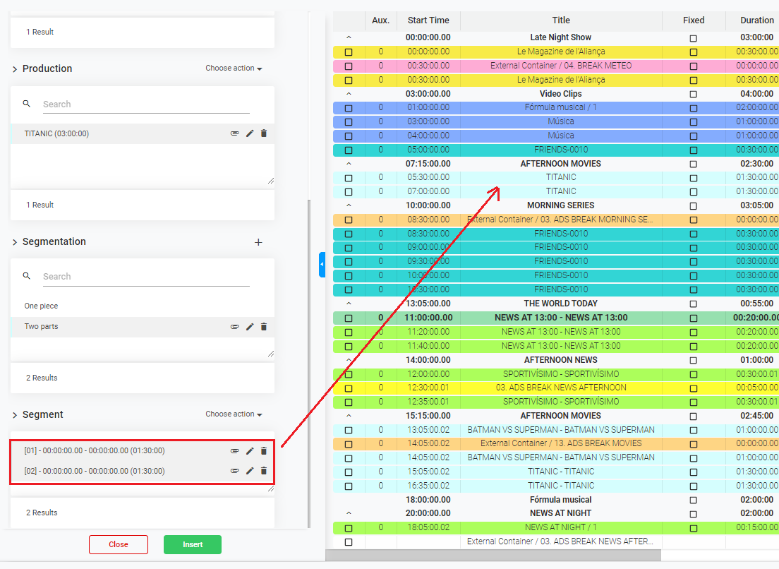 4. In the catalog will only appear the Content Types set as "Filling". Select the productions (segments) from the catalog that you want to use as Pre-Roll or Post-Roll Jingles, and click