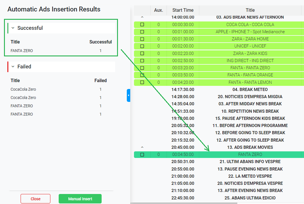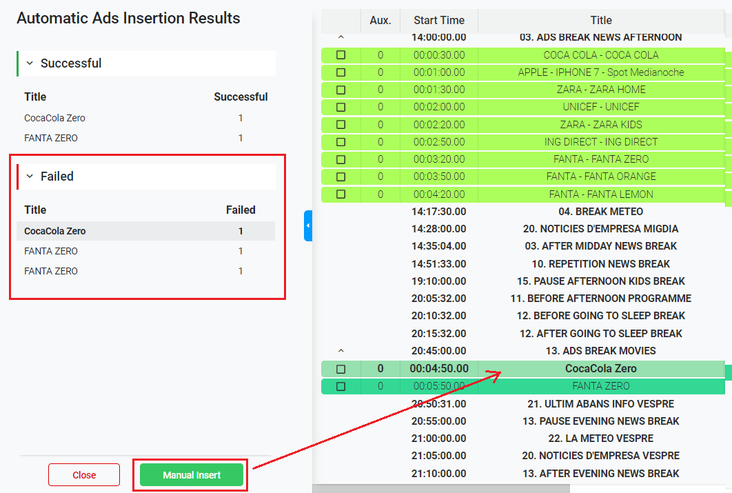 If there are some spots that couldn't be inserted automatically in the playlist, they will appear on the left panel in the "Failed" section, indicating the list of failed inserts. This could be due to having repetitions rules to avoid repeating the same product code item. For more information, about commercials repetition rules, go to Manage a Product Code