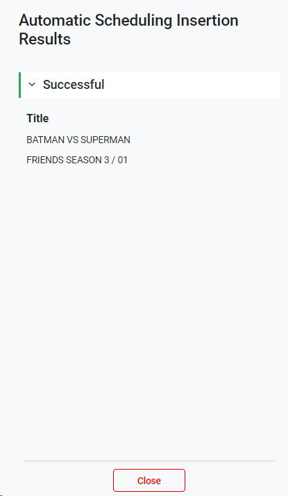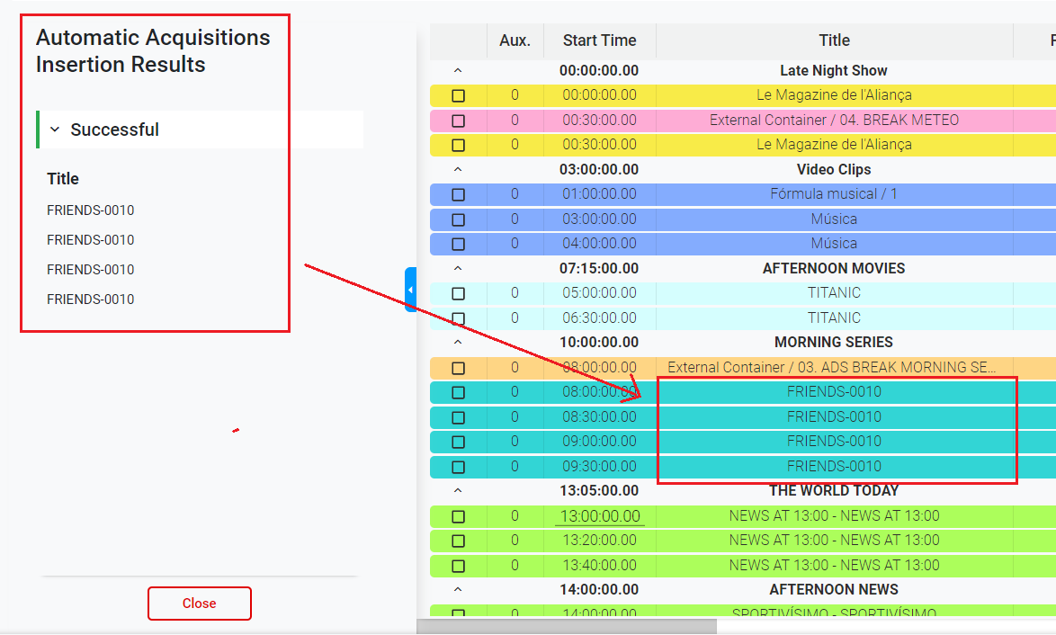 3. If there are scheduled showings for that specific day, the system will automatically insert the events in the corresponding block of the playlist. The successful and/or failed results will appear on the left panel.