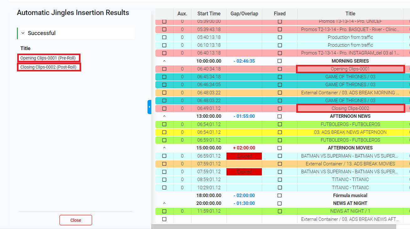 3. If there are scheduled Jingles in that specific day, the system will automatically insert the events in the corresponding blocks of the playlist. The successful and/or failed results will appear on the left panel.