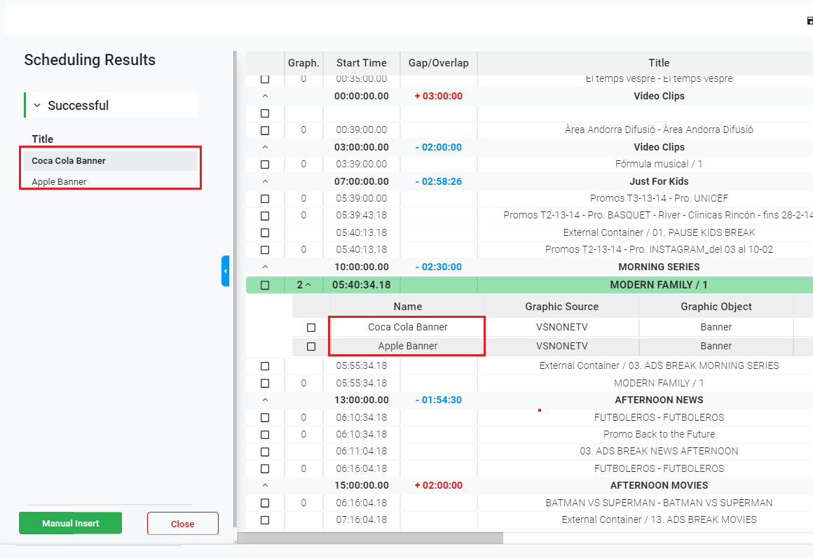 3. If there are scheduled Graphics in that specific day, the system will automatically insert the events in the corresponding blocks of the playlist. The successful and/or failed results will appear on the left panel.
