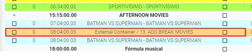 The available external containers that you can add into a playlist will be the ones belonging to the container type associated with the current subchannel. For more information, go to Subchannels and check the Container Types configuration parameters.