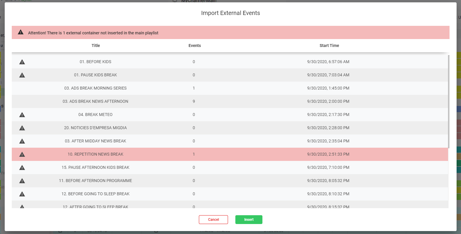 4. Click "Cancel" to cancel the operation or "Insert" to insert the external events in the main playlist.