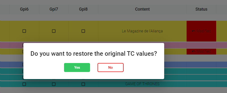 When you are modifying an event (time codes of the segment) that came with inherit parameters from the catalog, the column "Status" will indicate that has been modified respecting to its original parameters. Click to reset the values of the event to its original settings.