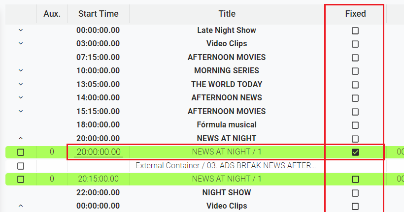 The "Fixed" column let the user force a Start Time for the selected event. When you check the "Fixed" value in one event, the Start Time column will be enabled to introduce manually the time code:
