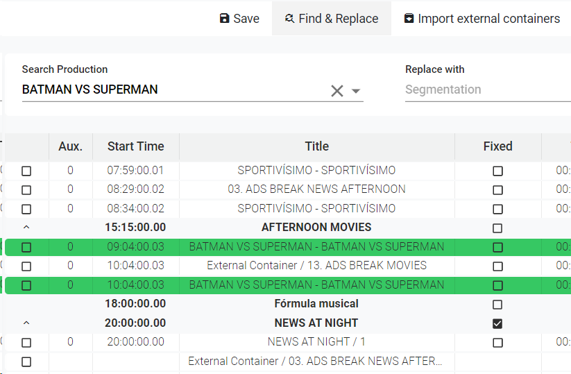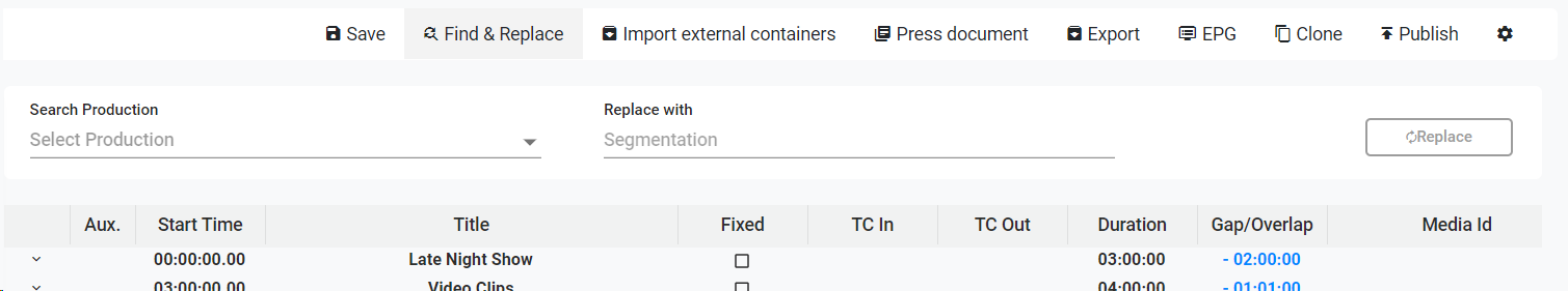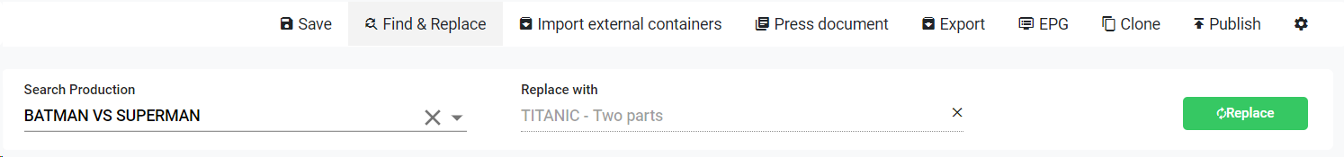This option is useful to do a massive change of events in the playlist. You can search existing productions in the playlist and replace them by another in the catalog. To do so:
