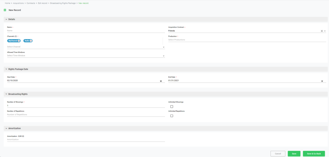 Click on to Add a new Broadcasting Right Package, related to the Acquisition Contract.