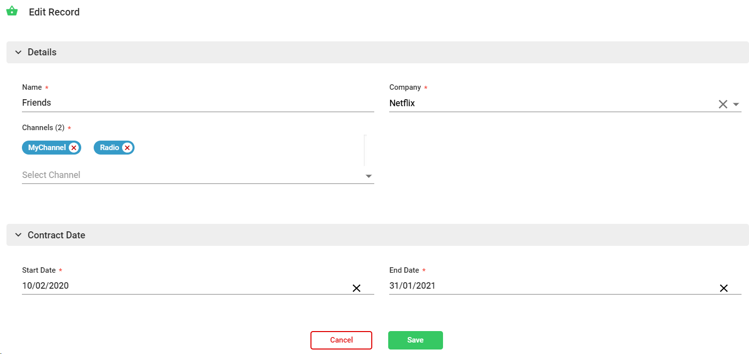 When editing an acquisition contract record, you will be able to modify the metadata fields of the form, as well as view or manage related elements to your contract (Broadcasting Rights Packages). The Broadcasting Rights Packages are entities associated with the contract than can be used to define specific broadcasting rights (such as number of available showings for specific productions, channels, period of times, etc.). The Broadcasting Rights Packages will be used to create the service orders or scheduling.