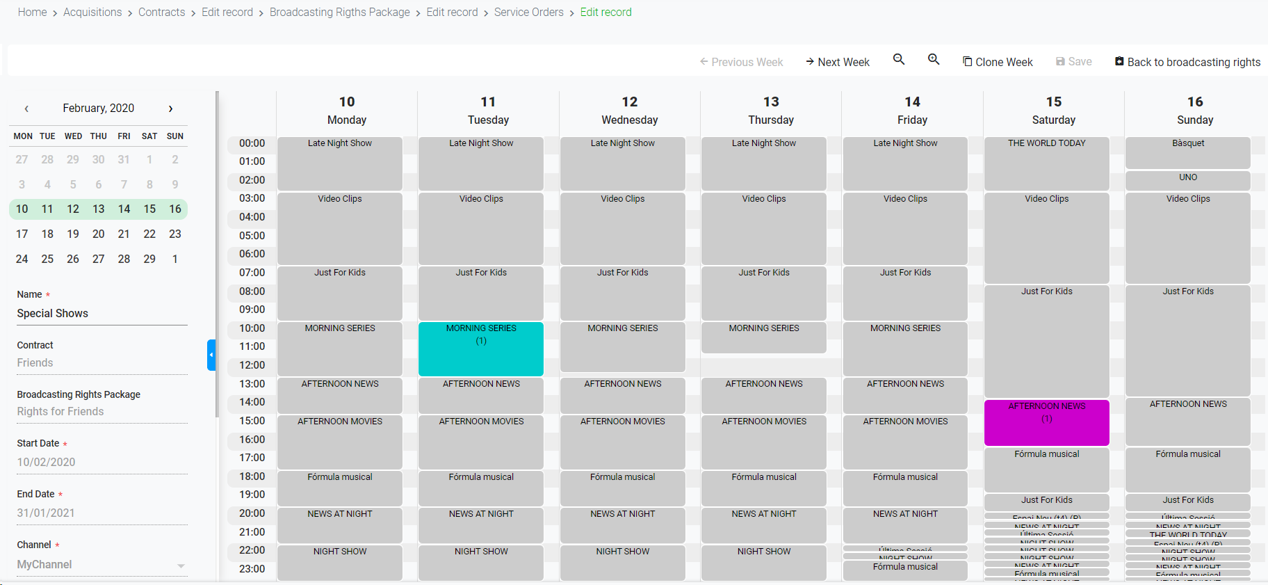 The Broadcasting Rights Packages are entities associated with the contract than can be used to define specific broadcasting rights (such as number of available showings for specific productions, channels, period of times, etc.). The Broadcasting Rights Packages will be used to create the service orders or scheduling.