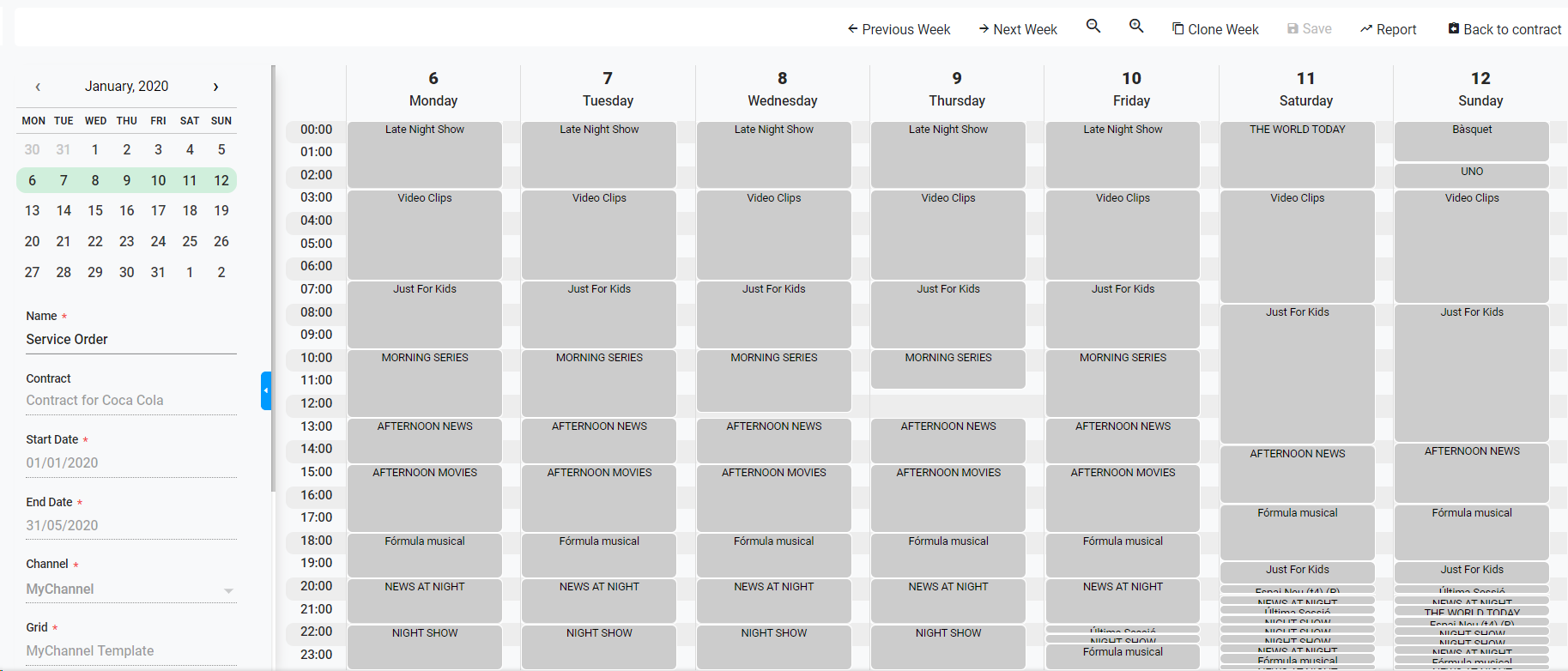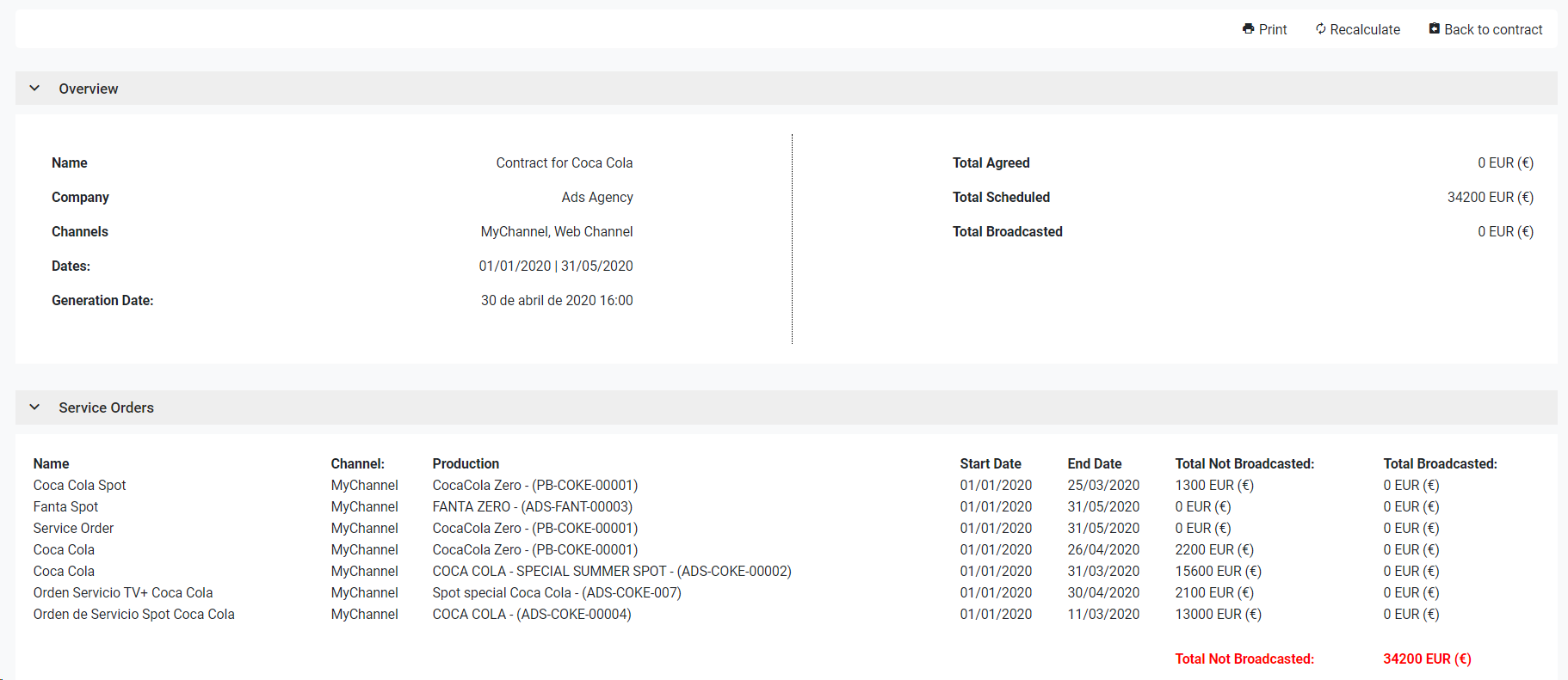 Click to generate an automatic report including all the information about the Commercial Contract and its related Service Orders, with the total amount information, comparing broadcasted vs scheduled.