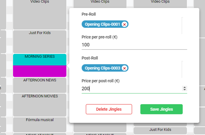 4. In the blocks, when scheduling Jingles, there will appear the option to select the productions that should be Pre-Roll and/or Post-Roll and the Price for each one, in that specific block and date/time. The Jingles will be linked to the specific block.