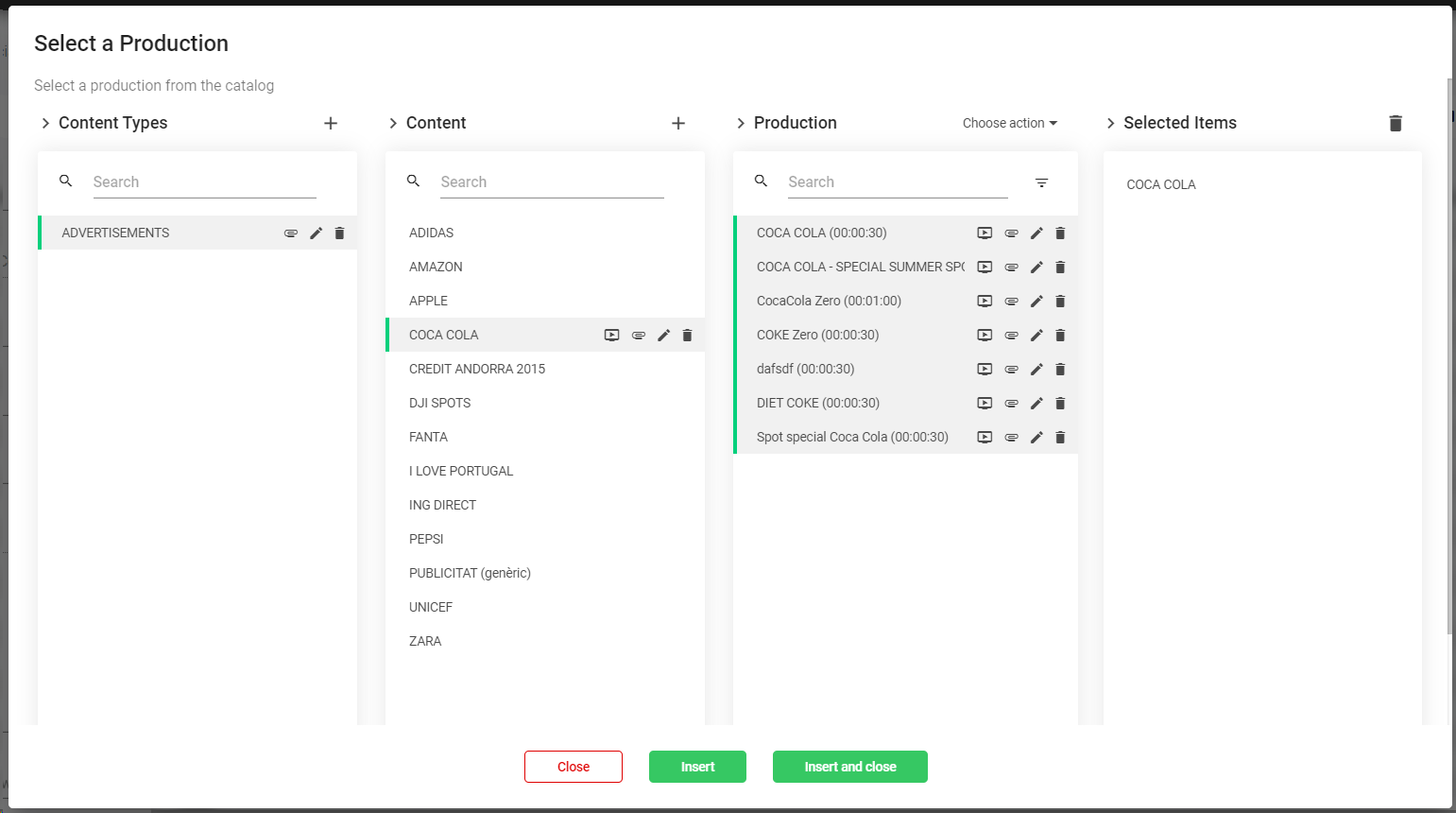 3. Click "Insert" to include the selected productions and keep selecting more, "Insert and close" to include the selected productions and close the window, or "Close" to close the window.