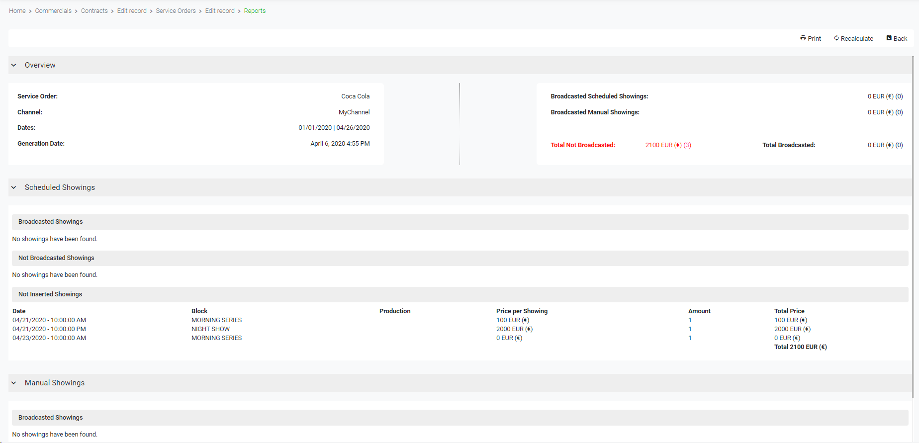 Click to generate an automatic report including all the information about the current Service Order and its individual scheduled showings, with the total amount information, comparing broadcasted vs scheduled.