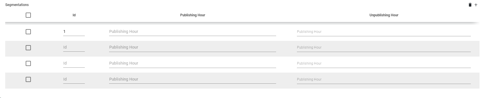 For each segmentation, introduce the Id, the Publishing and the Unpublishing hour. Every media version (segmentation) can be published or unpublished at different hours.