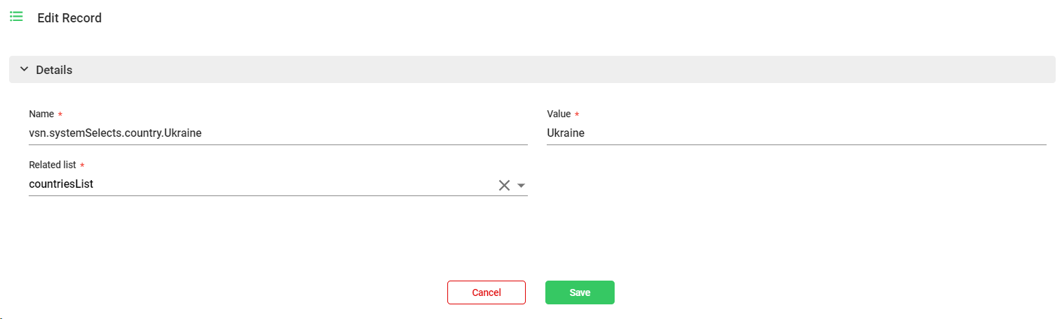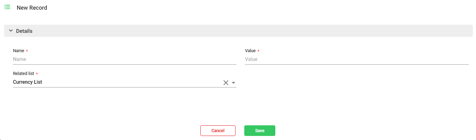 Click on this button to create a new list value. A new dialog will appear, where you must introduce (at least) the mandatory fields: