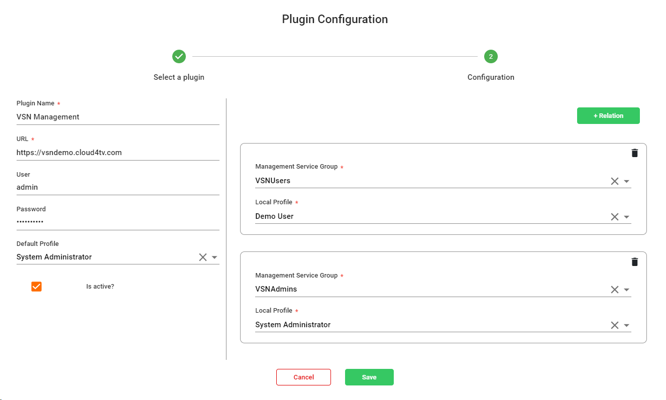 You will need to create relations for each of the Management service groups that you want to import, and map them with the local profiles in VSNCrea, as you can see in the image above.