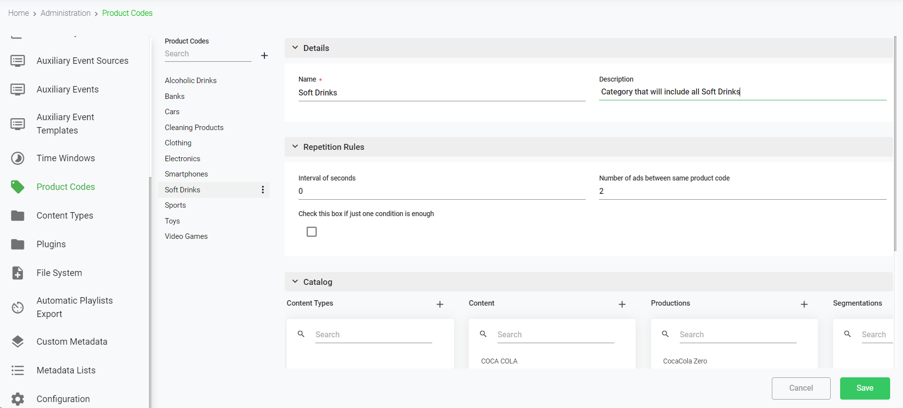 The Product Codes are used to classify the advertisements of the organization catalog into different categories mainly to be able to apply different repetition rules when scheduling the commercials.