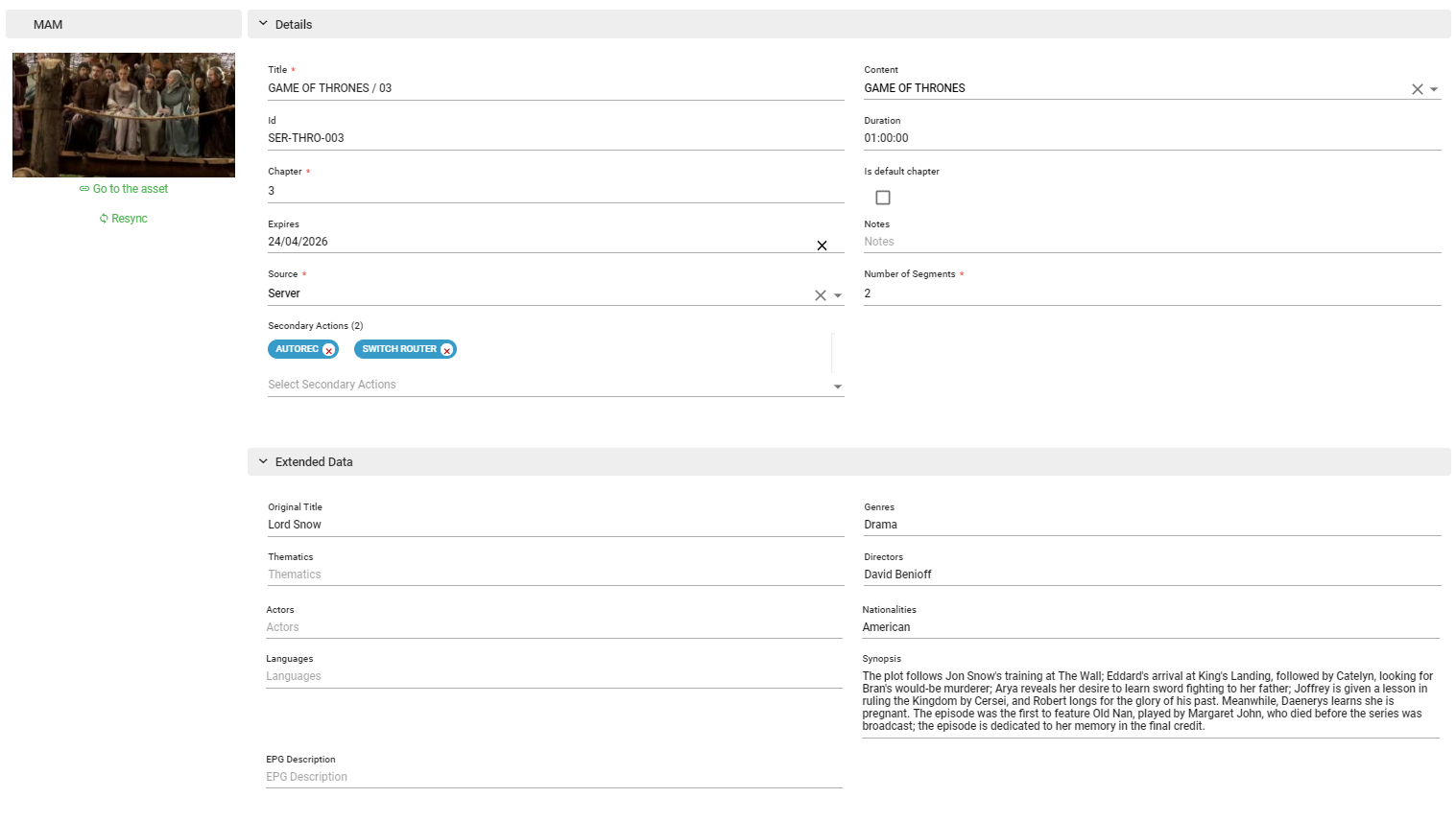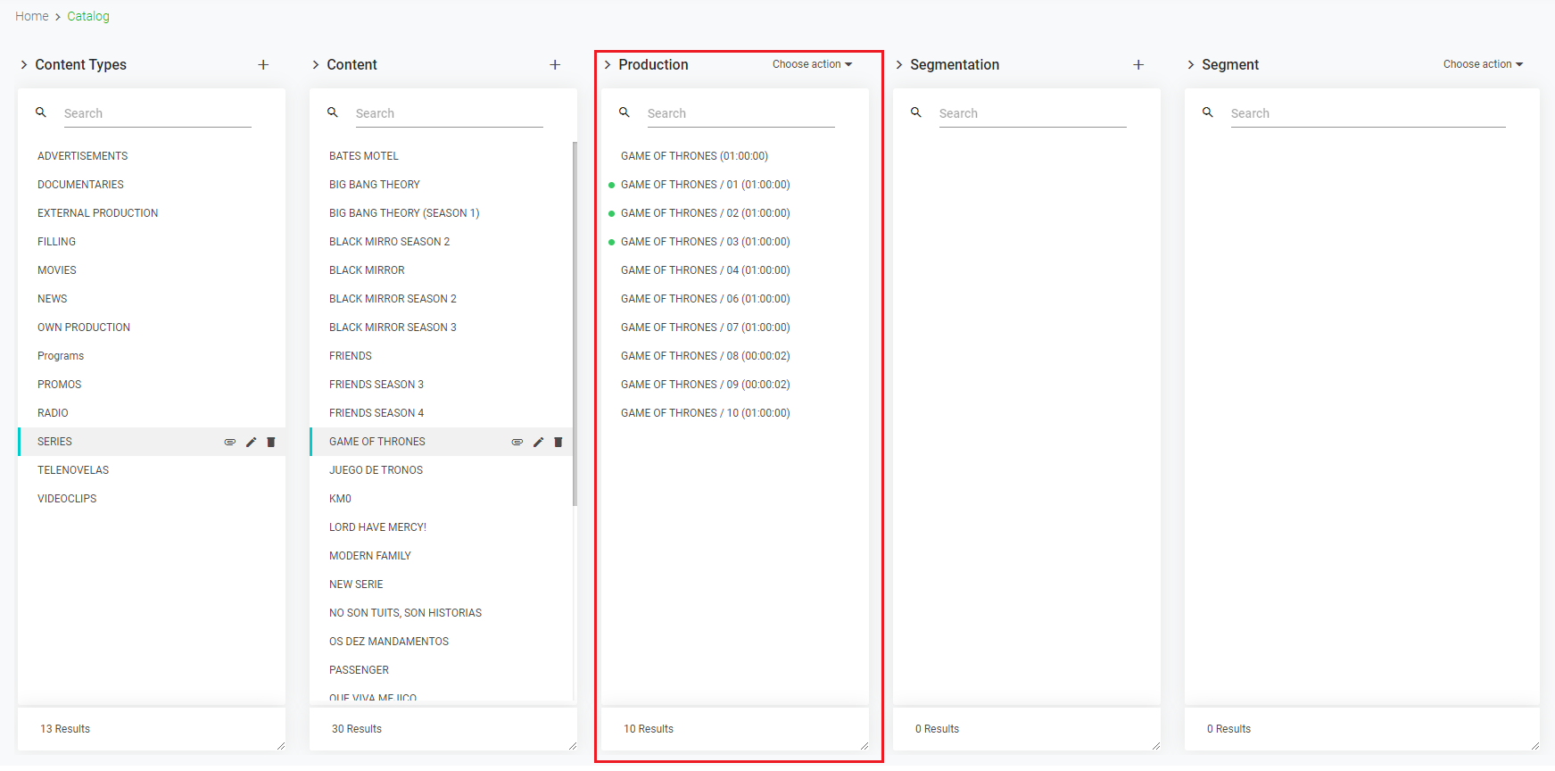 Productions are any piece of audiovisual material that can be broadcasted. With some exceptions, the production is the broadcast unit. Some examples of productions are: a movie, an episode of a drama serial, an advertisement spot, or a live show like the newscast of a particular day and time.