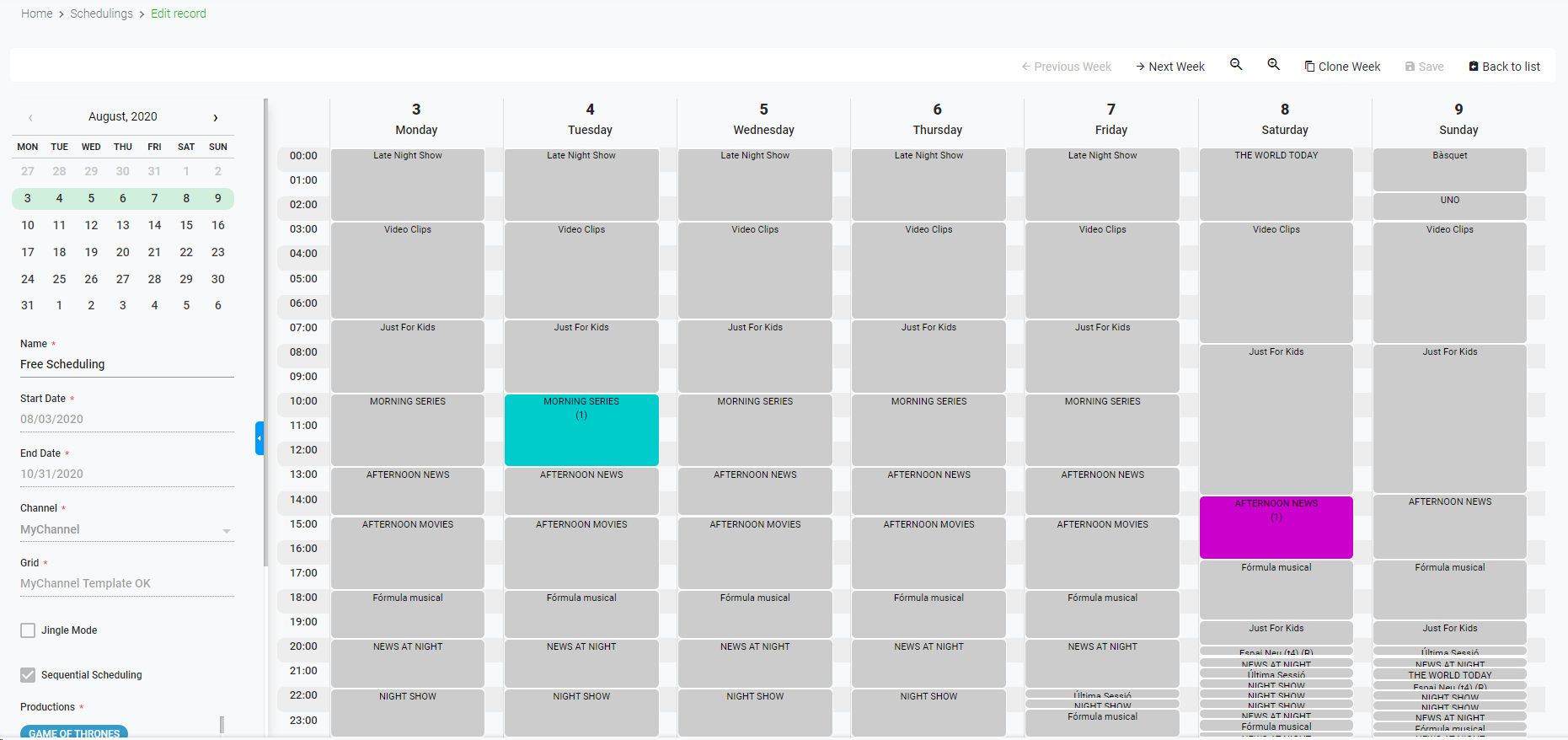 The Scheduling module allows users to do a long-term scheduling in a free way, for content that is not related to any acquisition or commercial contract.