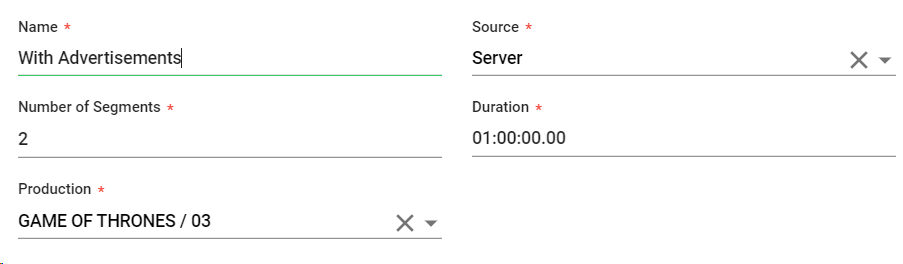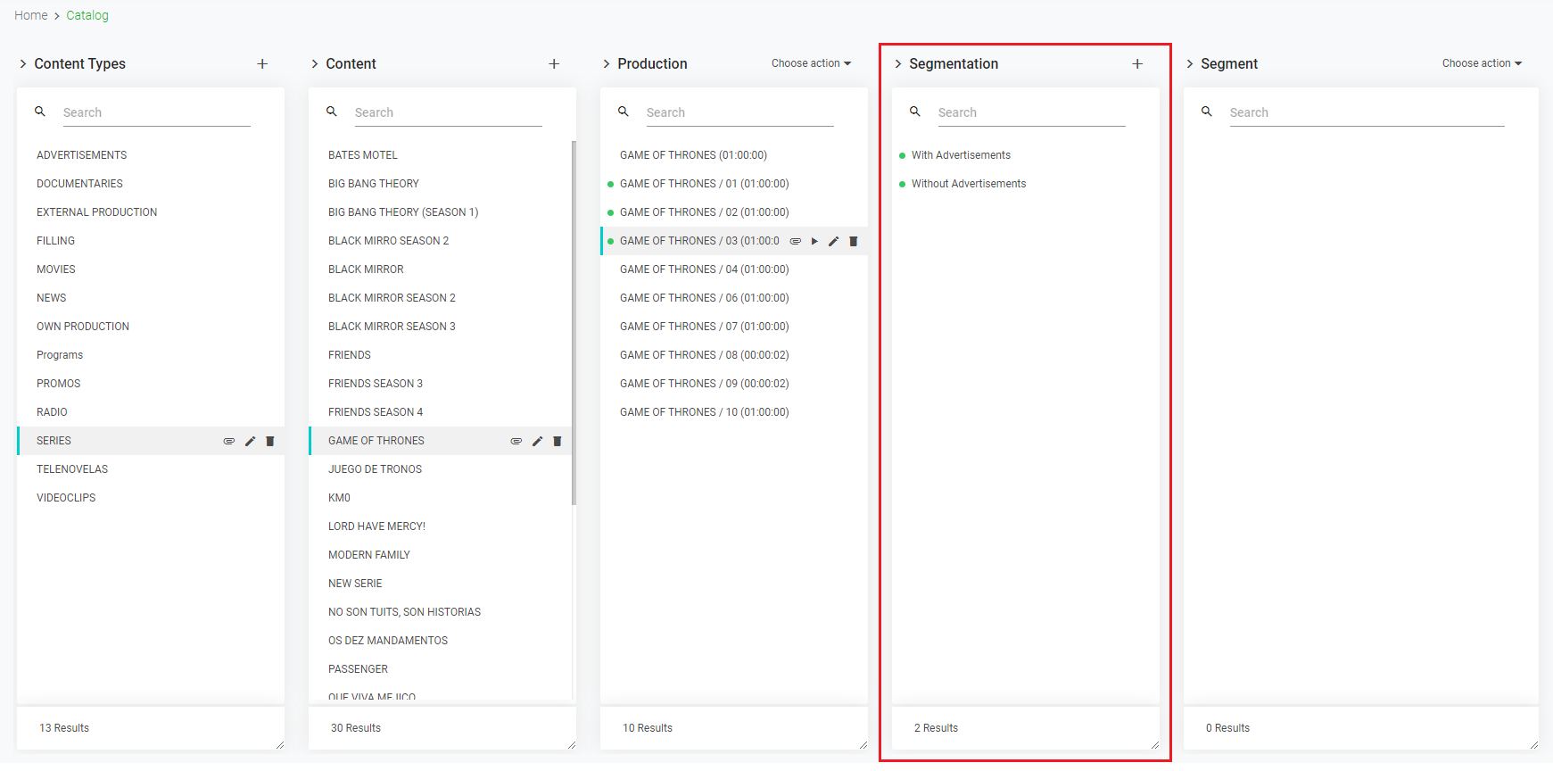 Productions can be divided into different groups of segments. Segmentations are groups of segments that represent a specific version of a production. A production may have one or more segmentations, with different segments. Thanks to segmentations a production can be broadcasted intermingled with other productions (e.g. commercials). Thus, for example, we can make a segmentation of a production consisting of two segments (one commercial break) and another consisting of three segments (two commercial breaks). With segmentations we can also have different versions of the same production (e.g. a segmentation of a movie with closing credits and another segmentation without them).