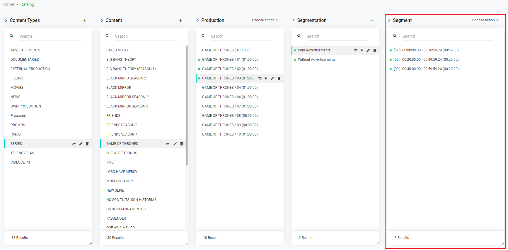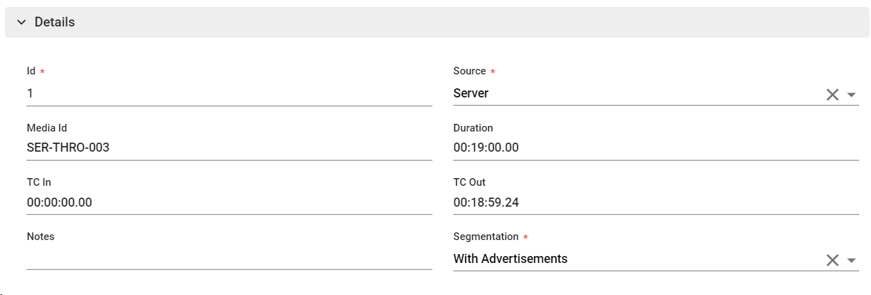 The segments are the broadcast units on how a production is divided. One segmentation can have several segments that could belong to the same media (with specific time codes) or to different medias. The Media ID of the segments will be created based on the pattern defined in the Source.