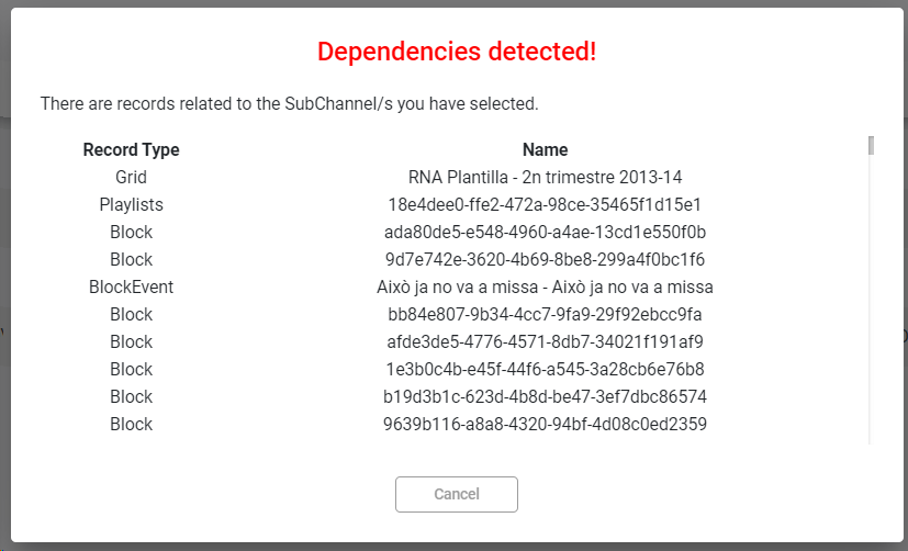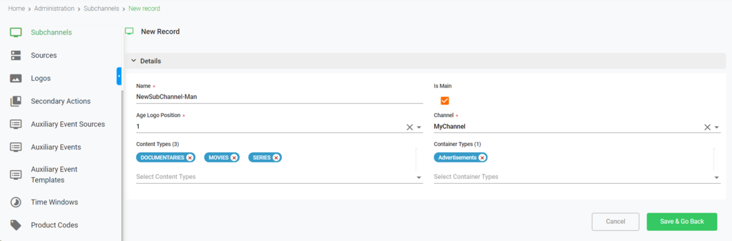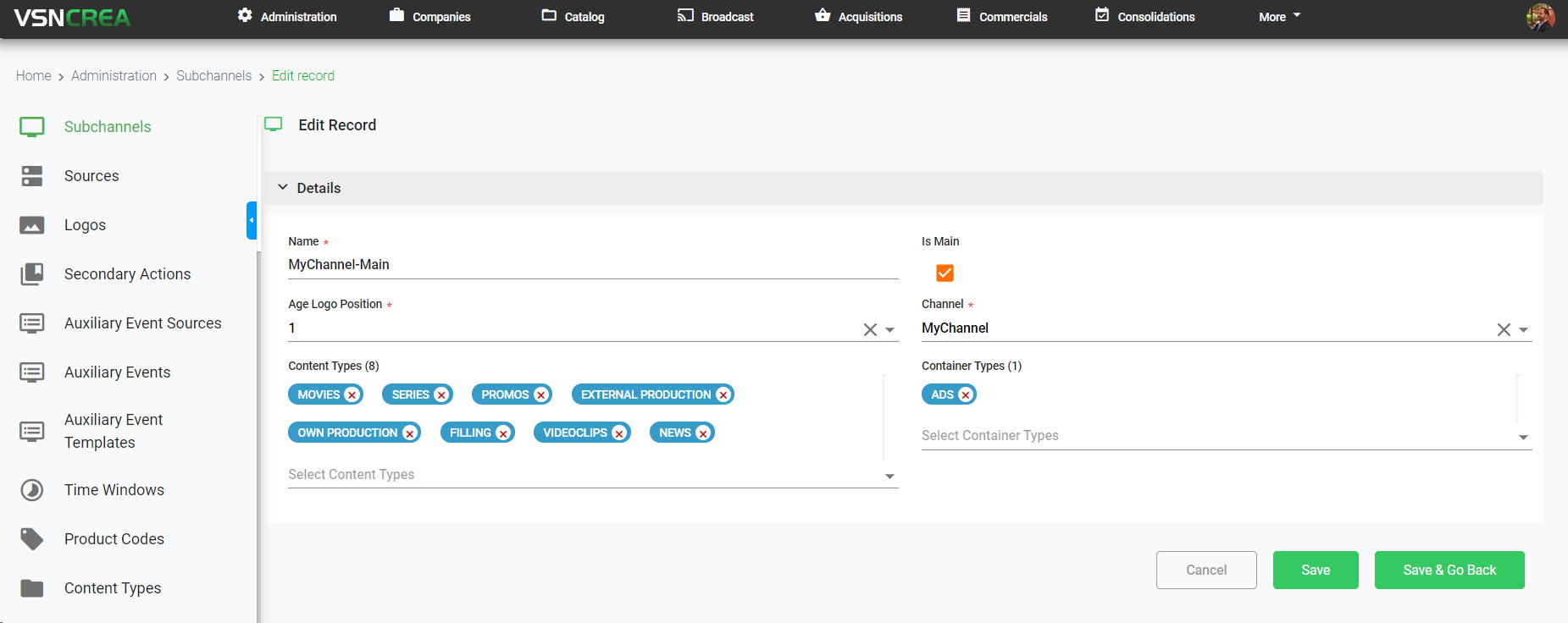 The Subchannels are used to split one channel into different subdivisions for different purposes in terms of type of content and user permissions. The most typical situation is to have 2 subchannels , as divisions of a Channel. Where one could be the main subchannel with the entire scheduling, and the other could be a secondary subchannel just to manage the advertisements by the Commercial Department. Both schedulings will be merged together to the main subchannel when constructing the final playlists.