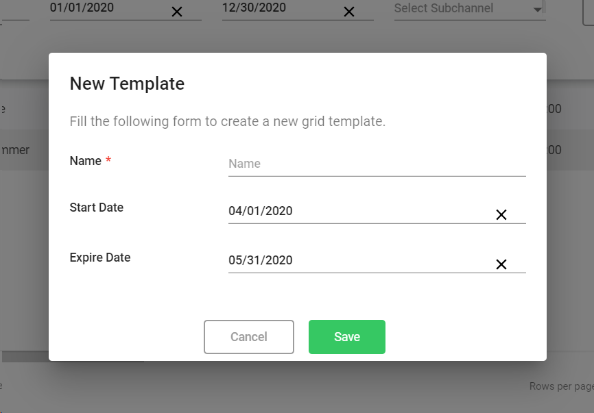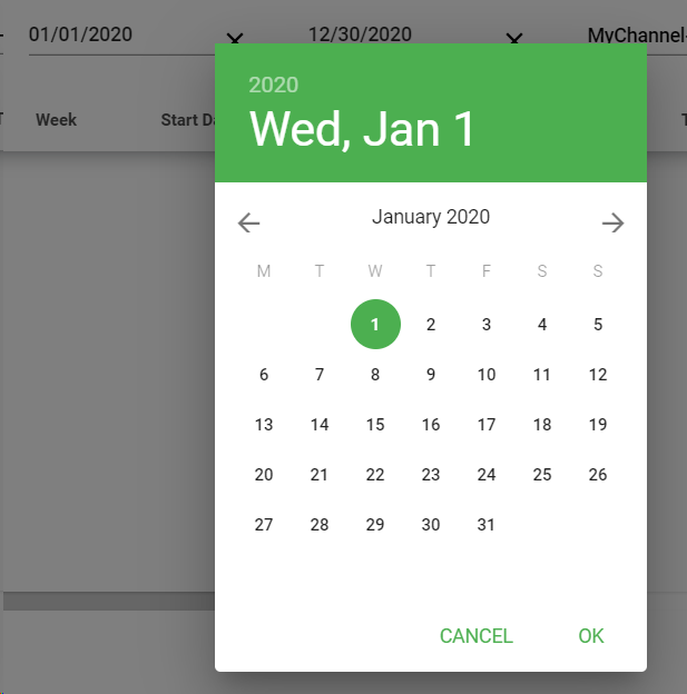 Start Date. Pick a date from the calendar, when the template will start to be available. This date should be the first day of the week, that will depend on the format settings of the channel. For more information go to Channels