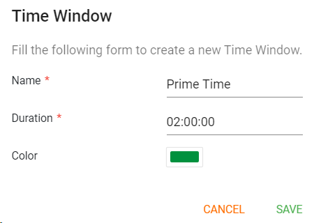 The new Time Window will appear in the list of Time Windows of the selected channel. Once finished, click "Cancel" to cancel or "Save" to save the modifications