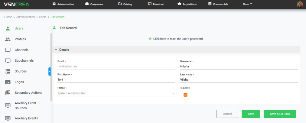 This will open the user metadata form, to edit the record.