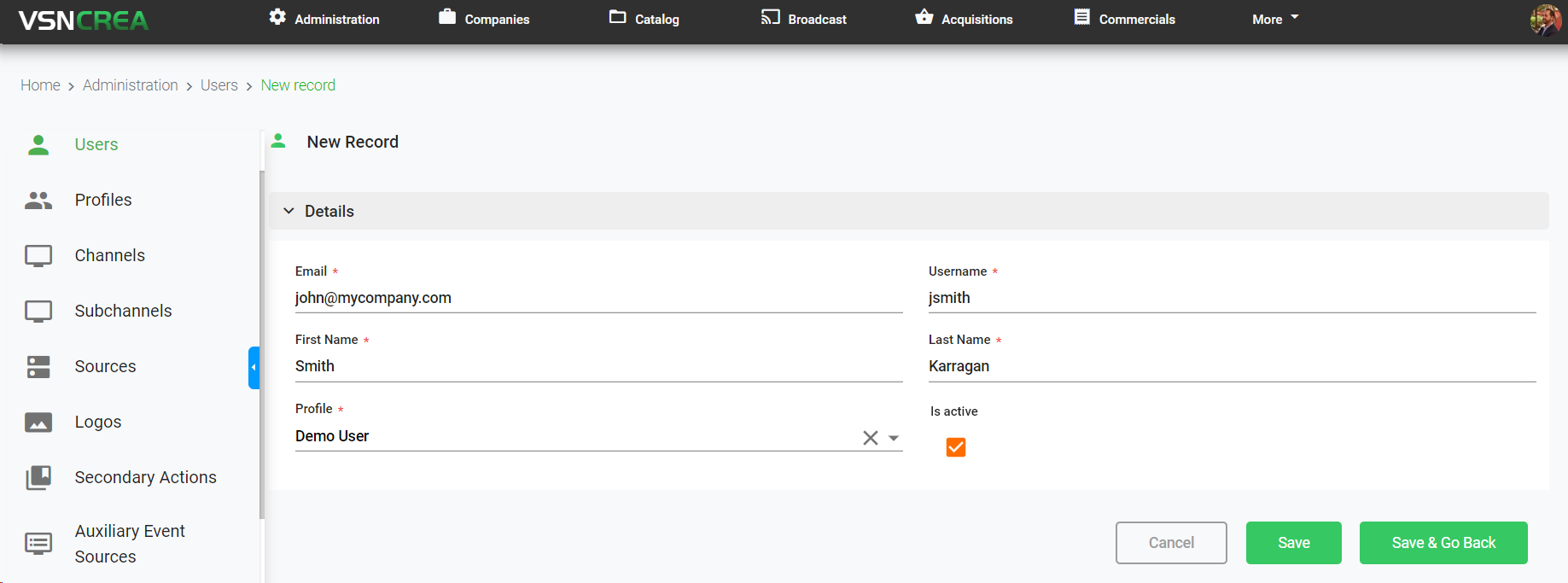 To cancel the operation, click "Cancel". To save the changes and keep in the creation form, click "Save". To save the changes and go back to the previous list, click "Save & Go Back".