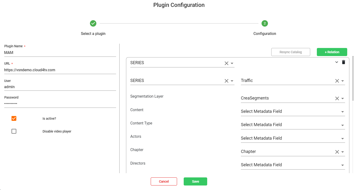 To map metadata from VSNCrea with metadata of VSNExplorer, you need to create one relation for each Content Type of the catalog. In each relation, you can decide which fields of the productions should be sent to VSNExplorer asset metadata tables